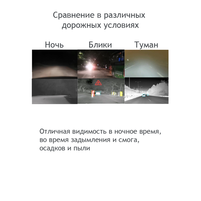 Тепловизионная система для Android магнитолы с разрешением камеры 256×192p на автомобиль с модулем аналитики. Распознавание и выделение транспортных средств и пешеходов, визуальное и звуковое предупреждение о возможном столкновении. Функция автоматического обогрева, автоматическая компенсация затвора. Шумоподавление и улучшение качества выходного изображения.